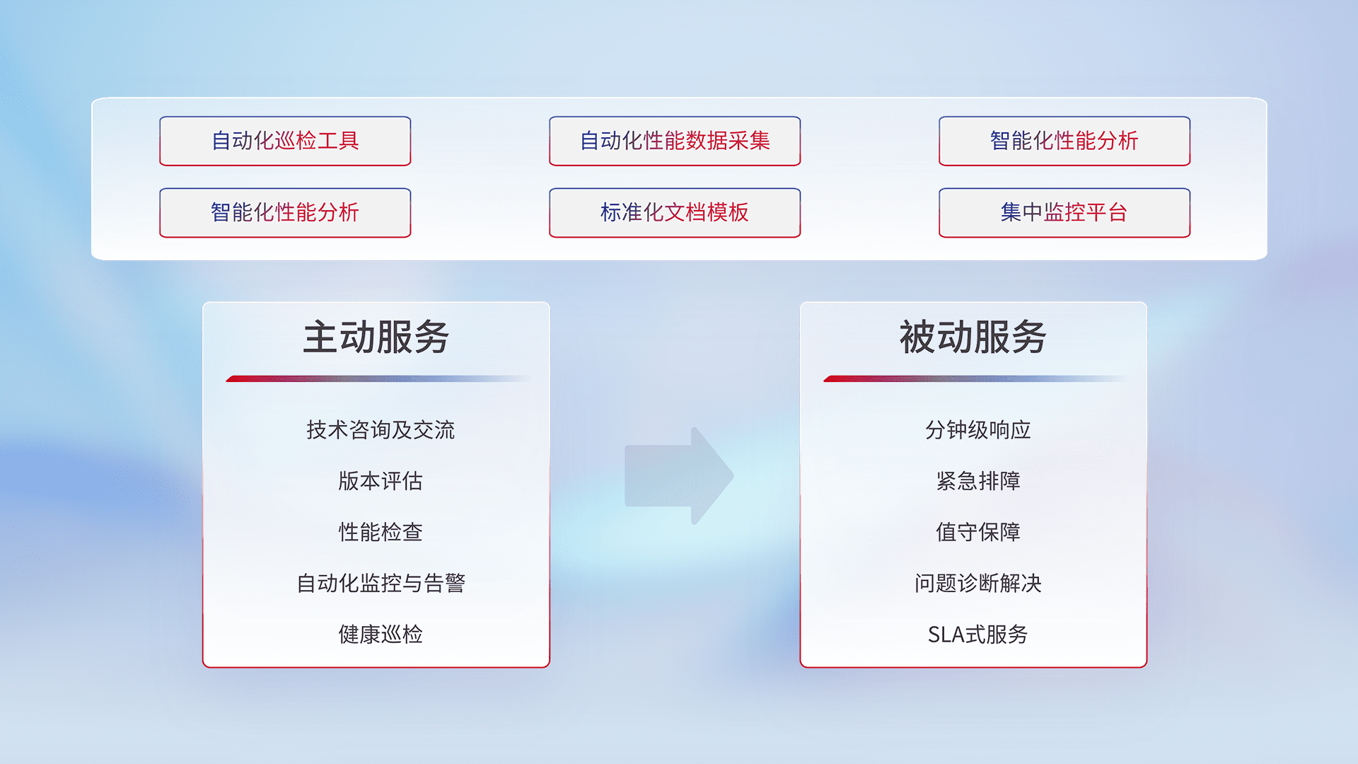 智能化工具和标准化文档,,,,保障服务质量,,,,提供主动服务(包含技术咨询、、、版本评估、、、、性能检查、、、自动化监控与告警、、、、健康巡检)和被动服务包含(分钟级响应、、紧急排障、、值守保障、、、问题诊断解决、、、SLA服务)。。